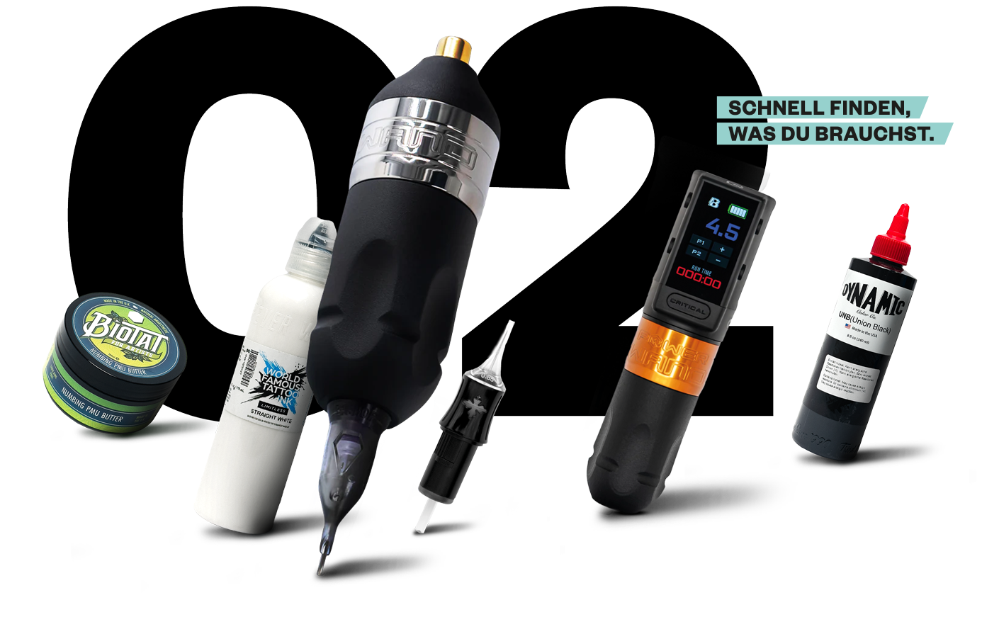 Your customized setup is essential when the needle is running. A smooth-running tattoo machine, REACH-compliant inks that are easy to work with, and cartridges that run reliably ensure a high level of control during tattooing and a good feeling for the customer. The setup should be protected with grip tape, covers, and barrier film to prevent unwanted contamination. Cellulose wipes, petroleum jelly, or another good glide product ensure that you can work cleanly and protect the skin. Every line counts, and your favorite tools ensure that your artwork can be perfectly executed.